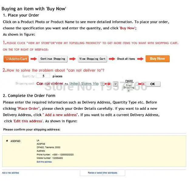 2: Customer should confirm the delivery information when order,cause we send the goods according the details which you leave in the aliexress.If there need any change,please have a note there.